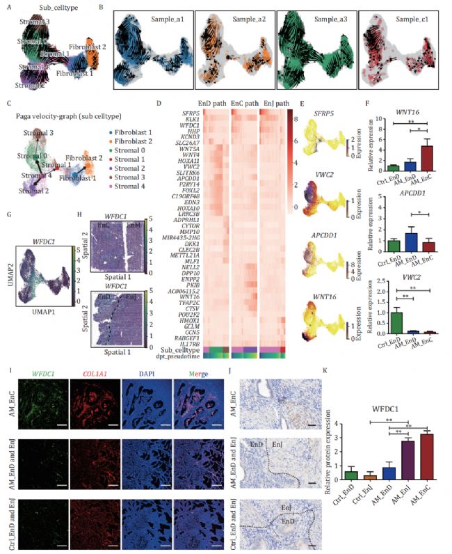 為了深入了解基質分化,我們生成了基質亞群的RNA速率圖,預測了三種發育軌跡(圖4A)。基質簇4細胞位于擬時間軌跡的起始點,提示基質簇4是基質細胞的祖細胞。基質簇4指向基質0,然后是基質3表示正常子宮內膜路徑(EnD路徑),基質簇4指向基質2表示異位病變路徑(EnC路徑),基質簇4指向基質1表示子宮內膜-子宮內膜交界處路徑(EnJ路徑)(圖4C)。值得注意的是,3例子宮腺肌癥患者的軌跡方向完全一致(圖4B)。接下來,我們繪制了細胞亞群之間和沿擬時間軌跡的差異表達基因圖譜(圖4D)。在祖基質細胞中檢測到SFRP5的顯著上調,主要定位于基質簇4(圖4D和4E)。鑒于其作為WNT信號通路抑制因子的作用,該基因編碼一種蛋白激素,可能潛在地調節子宮腺肌癥發病機制。在EnD通路中,WNT信號通路相關基因(如APCDD1、VWC2、WNT5A、WNT4和子宮發育基因(包括HOXA10、HOXA11、FOXL2)上調。EnC通路中,ENPP2、PKIB、WNT16和NELL2的表達量為細胞級增加(圖4D和4E)。為了驗證路徑中的基因,我們通過qRT-PCR進一步驗證了WNT16、APCDD1、VWC2的表達水平(圖4F)。為了進一步確定基質簇4的特征基因,我們發現WFDC1是最頂端的標記基因,它與炎癥、修復和細胞遷移相關,主要在基質簇4中表達(圖3C和4G)。通過空間轉錄組分析,WFDC1+細胞主要富集腺肌病的EnD、EnJ和EnC(圖4H)。因此,我們通過FISH和IHC染色進一步驗證,發現WFDC1主要表達在子宮腺肌癥的EnC和EnJ區(圖4I-K)。綜上所述,間質祖細胞在子宮腺肌病中向病變細胞或正常子宮內膜分化的過程具有不同的軌跡,說明WFDC1+間質祖細胞可能作為病變特異性間質簇的前體細胞,在子宮腺肌病的發生發展中發揮重要作用。