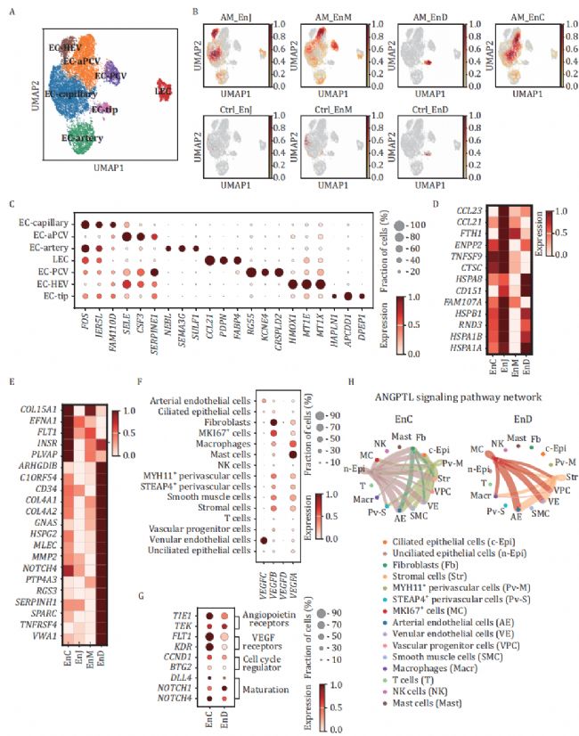 內皮細胞(EC)在EnC中明顯增加,這表明在腺肌病變中發生了血管生成(圖1G)。我們確定了7個EC亞群,它們在腺肌病組織中分布不同(圖5A、5B)。如EC -毛細血管簇主要分布在EnC、EnJ和EnM,對照組和子宮腺肌癥組相似。此外,基因表達分析顯示,不同腺肌病區免疫相關基因和血管生成相關基因表達上調差異(圖5C和5E)。在EnJ中,與趨化因子相關的基因(CCL23、CCL21和免疫反應(TNFSF9、CTSC)的表達增加(圖5D)。在EnD中,血管生成相關基因,如ARHGDIB 和GNAS主要上調(圖5E)。通過空間轉錄組觀察,在病變周圍分布的質膜囊泡相關蛋白陽性(PLVAP+)細胞可以影響EC的通透性并調節血管通透性。此外,我們的研究還揭示了不同細胞類型中不同的血管內皮生長因子(VEGF)和ANGPT信號模式,表明復雜的血管生成環境(圖5F)。血管生成信號和新生血管在內皮細胞亞群中發生改變。EC-tip響應血管生成信號,遷移和增殖形成新的血管結構,并分化為毛細血管內皮、動脈內皮和靜脈內皮亞型。免疫球蛋白樣結構域1和EGF樣結構域1的ANGPT和TIE1、FLT1、VEGFR1和VEGFR2在EC-tip細胞EnC中的上調表明血管生成活躍(圖5G)。此外,Notch信號的激活表明EC-尖端細胞成熟(圖5G)。此外,ANGPT- tie軸被認為對血管生成至關重要,并且在子宮腺肌癥的EnC中觀察到ANGPTL、 ANGPT和VEGF信號的廣泛細胞間通訊(圖5H)。在EnC中,ANGPTL信號從nCili上皮細胞、肌球蛋白重鏈11 (MYH11+)血管周圍細胞和成纖維細胞釋放,并靶向內皮細胞、基質細胞和STEAP4+血管周圍細胞。總體而言,在腺肌病區發現內皮細胞異質性和血管生成相關的差異信號。異常的血管通透性和血管生成可能導致大量月經出血等癥狀。
