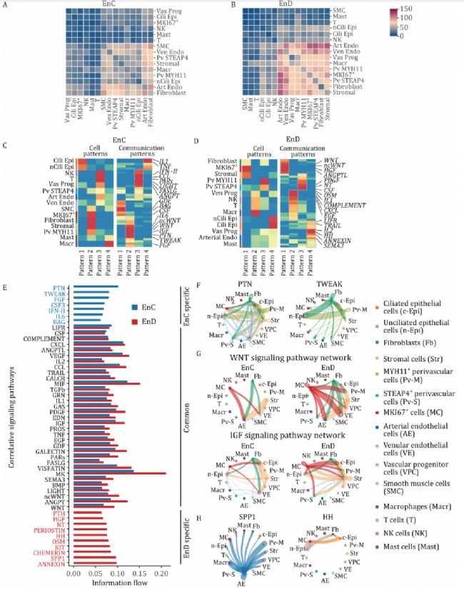 EnC和EnD在關鍵信號通路如WNTs、胰島素樣生長因子(IGFs)和TNF中差異表達(圖6G)。EnD中由增殖標志物Ki-67 (MKI67+)細胞、成纖維細胞和基質分泌的WNTs和IGFs在EnC中減少。免疫細胞,特別是巨噬細胞和T細胞的通訊也發生了變化,誘導TNF、CSF、LIFR和IL2信號通路。綜上所述,我們的發現顯示了腺肌病組織中通信模式的改變。觀察到信號通路的變化,包括與細胞增殖、血管生成和免疫反應相關的信號通路。這表明子宮腺肌癥的微環境發生了動態變化,導致了其復雜的病理生理。