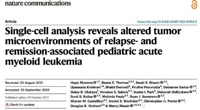 Mumme H, Thomas BE, Bhasin SS, Krishnan U, Dwivedi B, Perumalla P, Sarkar D, Ulukaya GB, Sabnis HS, Park SI, DeRyckere D, Raikar SS, Pauly M, Summers RJ, Castellino SM, Wechsler DS, Porter CC, Graham DK, Bhasin M. Single-cell analysis reveals altered tumor microenvironments of relapse- and remission-associated pediatric acute myeloid leukemia. Nat Commun. 2023 Oct 5;14(1):6209. doi: 10.1038/s41467-023-41994-0. PMID: 37798266; PMCID: PMC10556066.