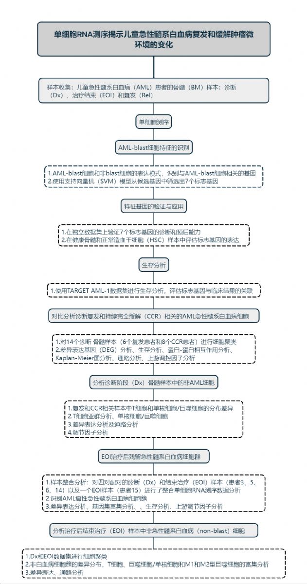 從亞特蘭大兒童保健中心(CHOA)獲得的冷凍骨髓(BM)樣品,使用10x平臺進行了單細胞轉錄組測序。共有20例患者的31個骨髓(BM) 樣本。在31個 BM 樣品中,19個診斷(Dx) (1D-14D,16D-20D),10個誘導結束(EOI )(3E,5E,6E,14E-20E),2個復發(fā)(Rel)(5R,6R)。因此,有9對配對的 Dx 和 EOI 樣品,其中4個用于開發(fā)7個基因標志物(患者3,5,6和14) ,5個用于驗證7個基因標志物(患者16-20)。兩名患者(5和6)在診斷(Dx),誘導結束(EOI)和復發(fā)(Rel)采集樣本。