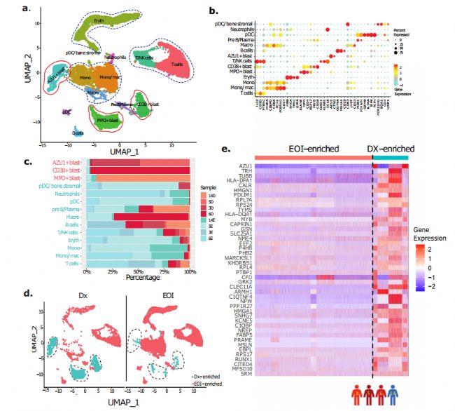對來自四個配對的診斷(Dx),誘導結束(EOI)樣品(患者3,5,6,14)的scRNA-seq 數據進行比較分析。經過質控之后,對19,350個細胞進行無監(jiān)督分析聚類為14個細胞簇(圖1a)。根據分化免疫細胞和基質細胞的marker基因的表達,對其中 11 個簇進行手動注釋(圖1b),其他細胞群被推定為急性髓系白血病細胞簇(圖1b)。分化的免疫細胞包括 T 細胞、B 細胞 、單核細胞 、巨噬細胞、單核細胞/巨噬細胞、漿細胞樣樹突狀細胞、前 B/漿細胞和中性粒細胞 (圖1b)。這些急性髓系白血病細胞簇具有患者特異性,反映了急性髓系白血病細胞之間的異質性(圖1c)。UMAP分析顯示,三個典型急性髓系白血病細胞簇在Dx樣本中過度表達,EOI樣本中有更多的分化細胞(圖1d)。