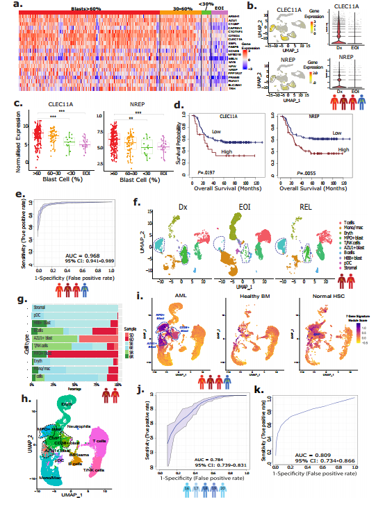 在 44 個基因中,選擇了 20 個在 Dx AML 細胞中表現出特異性過表達的基因(與治療后非AML細胞相比)進行進一步評估。與 TARGET AML-1 數據集中 <30% 的急性髓系白血病細胞和 EOI 樣本相比,所選 20 個基因在 >60% 和 30-60% 的急性髓系白血病細胞樣本中的表達更高(圖 2a)。這些在急性髓系白血病細胞中過表達的基因包括與抗凋亡相關的基因(如PRAME、MSLN、CITED4)、造血前體細胞生長因子(如CLEC11A)、細胞增殖相關基因(如CAPRIN1),以及PPARα誘導的增殖和腫瘤生長相關基因(如FABP5)。NREP和CLEC11A兩個基因被確認與AML急性髓系白血病細胞密切相關。在配對的Dx和EOI樣本中鑒定的三個急性髓系白血病細胞簇中,這兩個急性髓系白血病細胞相關基因(NREP和CLEC11A)顯示出高表達(圖2b),其表達水平相當于或優(yōu)于目前臨床上用于鑒定AML急性髓系白血病細胞的基因(如CD34、MPO、CD33和CD56/NCAM1)。