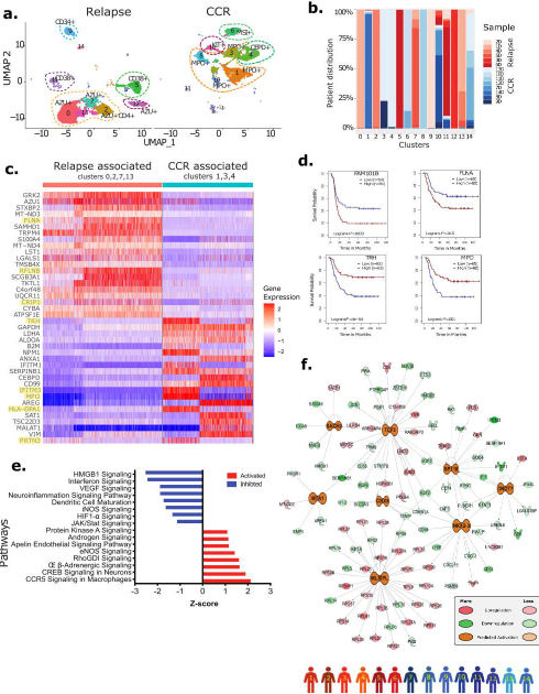 為了深入探究AML急性髓系白血病細胞的特性,我們對這些細胞進行了篩選和重新聚類。通過UMAP分析,我們發(fā)現無論是復發(fā)還是持續(xù)完全緩解(CCR)的急性髓系白血病細胞,在轉錄層面上都展現出較高的相似性(見圖3a)。在AML患者中,不同患者的急性髓系白血病細胞基因表達模式存在顯著的異質性(見圖3b)。與CCR相關的細胞簇(第1、3、4簇)和與復發(fā)相關的細胞簇(第0、2、7、13簇)在差異表達基因(DEG)分析中具有較大的差異。與CCR相關的細胞簇中,MPO、IFITM3、TRH、PRTN3和HLA-DPA1等基因表達水平較高,而與復發(fā)相關的細胞簇中,CRIP1、FLNA和RFLNB/FAM101B等基因表達水平升高(圖3c)。生存分析顯示,復發(fā)相關細胞簇中過表達的FLNA和RFLNB/FAM101B基因與較差的總生存(OS)顯著相關(見圖3d)。相對地,CCR相關細胞簇中過表達的基因,例如MPO和TRH,與較好的OS顯著相關(圖3d)。