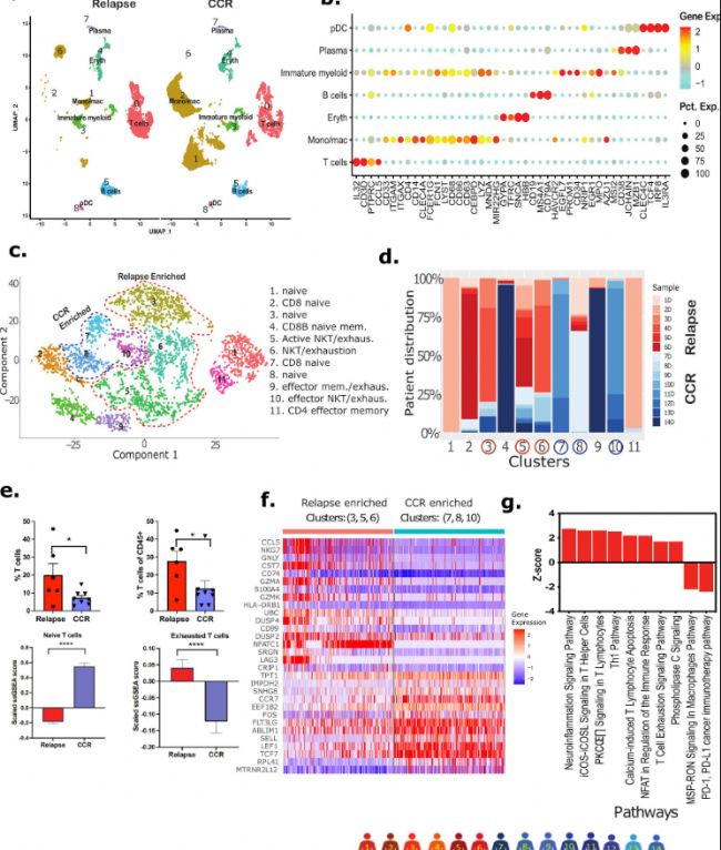 接下來,我們對診斷Dx時骨髓樣本中的非急性髓系白血病細胞進行了深入分析。UMAP揭示了復發(fā)和CCR相關樣本中細胞類型(特別是T細胞和單核細胞/巨噬細胞)的分布差異(圖4a)。為了了解特定亞型的T細胞是否與AML復發(fā)/CCR相關,T細胞分為11個不同的亞簇(圖4c)。結果表明,AML急性髓系白血病細胞對不同的幼稚和激活T細胞亞簇具有不同反應(圖4d)。幼稚T細胞(CCR7+,LEF1+,TCF7+)亞簇2、4和7顯著表達細胞毒性T細胞標記物(即CD8)。亞簇5、6、9、10和11是表達CCL5、KLRB1、KLRD1、GZMH、CD69和CD44的激活T細胞簇(圖4C)。復發(fā)和CCR相關樣本的比較分析顯示,前者的T細胞百分比顯著更高(圖4e)。此外,基于ssGSEA評分的T細胞耗竭估計顯示,復發(fā)相關樣本中耗竭T細胞的比例顯著高于CCR相關樣本(圖4e)。在CCR相關的T細胞亞群中觀察到更多顯著的幼稚T細胞(CCR7,LEF1,TCF7)(圖4e)。對包含復發(fā)相關亞簇(3,5,6)和CCR相關亞簇(7,8,10)進行DEGs分析(圖4f)。復發(fā)相關簇的上調DEGs的通路分析顯示多個免疫調節(jié)通路的顯著上調,包括Th1通路、鈣誘導的T淋巴細胞凋亡,以及T細胞耗竭通路的上調和PD-1與PD-L1癌癥免疫治療通路的下調(圖4g)。這些結果表明,復發(fā)和CCR相關的特定T細胞亞型的富集可能在治療后的結果中發(fā)揮作用。