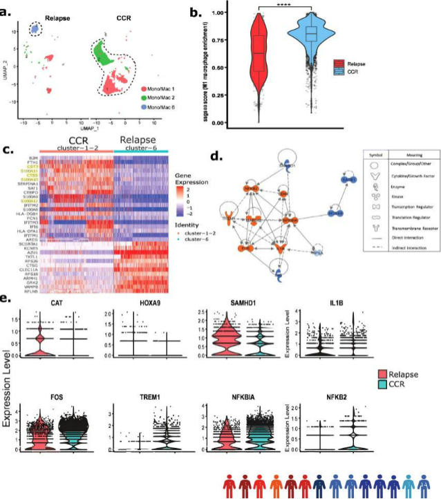 對Dx非急性髓系白血病細胞(來自患者樣本1-14)的集中分析確定了三種單核細胞/巨噬細胞,這些亞群在持續(xù)完全緩解(CCR)患者和復發(fā)患者的樣本中比例存在顯著差異(圖5a)。簇1和2富集了與CCR相關的樣本,而簇6僅有復發(fā)相關的樣本(圖5a)。與復發(fā)相關樣本相比,MCR相關樣本具有更多顯著的M1巨噬細胞(圖5 b)。在更多CCR相關樣本(簇1、2)和復發(fā)相關樣本(簇6)的DEGs分析中,發(fā)現前者上調了S100A炎癥基因家族、蛋白酶抑制劑、CST3和先天免疫系統(tǒng)調節(jié)因子CTSS(圖5c)。使用Dx CCR相關樣本DEGs進行的基因調節(jié)因子分析顯示,與M1型巨噬細胞極化相關的多個關鍵調節(jié)因子上調,FOS、TREM1、CD44和IL1B,以及與炎癥反應相關的NFKB2被激活(圖5d)。分析還識別了下調的關鍵調節(jié)因子,包括與AML進展相關的SAMHD1和SATB1(圖5d)。SAMHD1已被證明通過抑制NF-kβ和干擾素途徑在抑制先天免疫中發(fā)揮關鍵作用。對關鍵調節(jié)因子 FOS、TREM1、NFKB2 和 NFKBIA 基因表達水平的評估表明,它們在CCR相關樣本中表達較高,而在復發(fā)相關樣本中 CAT 和 SAMHD1 表達較高(圖 5e)。