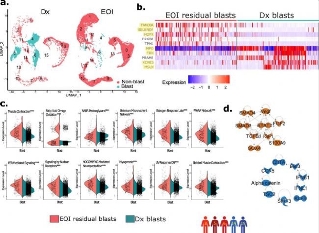 治療后 EOI 樣本 BM 微環(huán)境的表征對于揭示臨床中的急性髓系白血病細胞和非急性髓系白血病細胞狀況至關重要。為了識別 EOI 殘留急性髓系白血病細胞我們對四對配對的診斷(Dx)和結束治療(EOI)樣本(患者3、5、6、14)以及一個EOI樣本(患者15,其Dx樣本不可用)進行了整合數據分析。Dx 和 EOI 樣本與 Dx 樣本中富集的簇 4、6 和 8 能夠很好地整合在一起(圖6a)。進一步分析顯示,這三個Dx富集的簇由來自各個患者的細胞組成。這些Dx富集的簇(4、6、8)表現出7個特征基因的過表達,被指定為AML癌性急性髓系白血病細胞簇。在急性髓系白血病細胞簇中觀察到一小部分細胞來自EOI樣本(約占Dx樣本的6%)。為了確定治療后殘留腫瘤細胞的轉錄情況,我們對Dx急性髓系白血病細胞和治療后EOI殘留急性髓系白血病細胞進行了差異表達基因(DEGs)分析(圖6b)。EOI殘留急性髓系白血病細胞表現出與腫瘤生長和不良預后相關的多個基因的過表達,包括HOPX、SELENOP/SEPP1和FAM30A/C1orf110 53-55。進一步的基因集富集途徑分析顯示,在治療后EOI殘留急性髓系白血病細胞中,包括肌肉收縮、脂肪酸ω氧化和PPARα等多個途徑顯著上調(圖6c)。此外,對EOI殘留急性髓系白血病細胞中的DEGs進行的上游調節(jié)因子分析顯示,與上皮-間充質轉化相關的多個關鍵調節(jié)因子被激活,包括SOX4、STAT3和TGFB1(圖6d)?傊,與調節(jié)治療后EOI殘留急性髓系白血病細胞的骨髓微環(huán)境相關的基因和途徑的差異調控可能導致AML患者的總生存期縮短和無病生存期降低。
