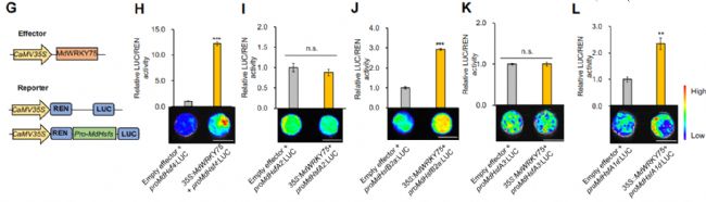 (H-L) MdWRKY75與MdHsf4 (H)、MdHsfA2 (I)、MdHsfB2a (J)、MdHsfA3 (K)和MdHsfA1d (L)啟動子相互作用的熒光素酶和相對LUC/REN活性圖像