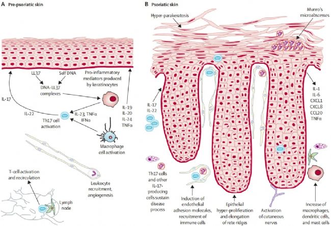銀屑病(Psoriasis),俗稱“牛皮癬”,是一種常見(jiàn)并易復(fù)發(fā)的慢性炎癥性皮膚病,具有特征性紅色丘疹、斑塊及銀白色鱗屑,頑固難治,頻繁復(fù)發(fā),罹患終身等特點(diǎn),其發(fā)病原因及發(fā)病機(jī)制均尚未完全明晰,目前認(rèn)為是遺傳和環(huán)境因素共同作用導(dǎo)致。