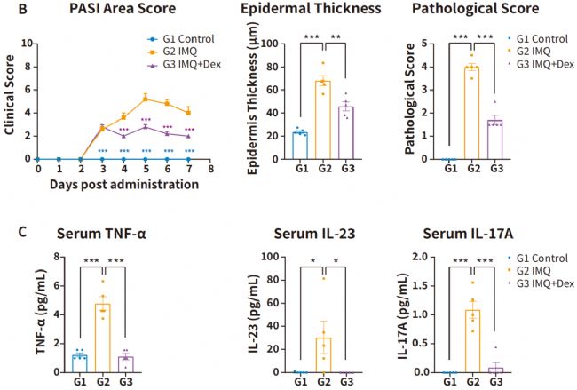 圖1. 在BALB/c小鼠背景上通過(guò)IMQ誘導(dǎo)的銀屑病小鼠模型。 a. 小鼠背部皮膚與病理切片, b. 小鼠病情評(píng)分, c. 血清炎癥因子表達(dá)檢測(cè)。 (*P<0.05,**P<0.01,***P<0.001)