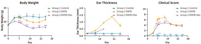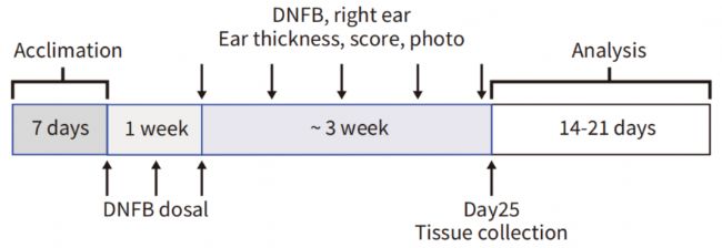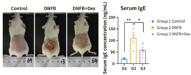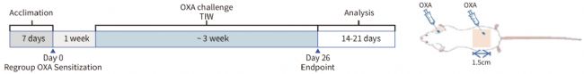 惡唑酮(Oxazolone,OXA)、2,4-二硝基氟苯(DNFB)是誘導(dǎo)AD模型常用的半抗原,使用時(shí)需要在小鼠皮膚上給予半抗原進(jìn)行初始致敏,然后進(jìn)行多次后續(xù)激發(fā)來(lái)引起AD樣病變。