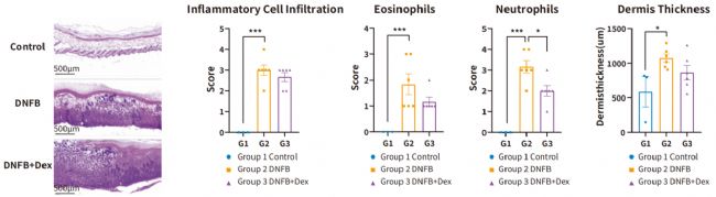 圖5. DNFB誘導(dǎo)的特異性皮炎小鼠模型的小鼠病理照片及病理評(píng)分。 (*P<0.05,**P<0.01,***P<0.001vsG2)