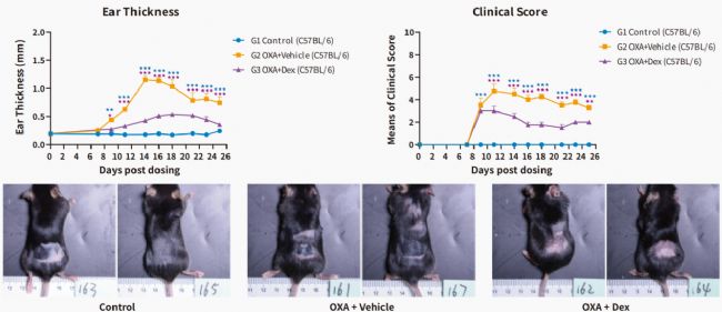 圖6. OXA誘導(dǎo)的特異性皮炎C57BL/6小鼠模型的小鼠背部照片及病情評(píng)分。 (*P<0.05,**P<0.01,***P<0.001vsG2)