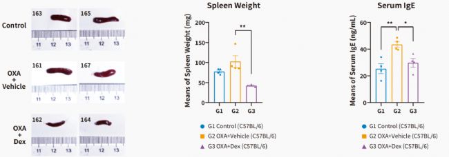 圖7. OXA誘導(dǎo)的特異性皮炎C57BL/6小鼠模型的免疫系統(tǒng)情況。 (*P<0.05,**P<0.01,***P<0.001vsG2)