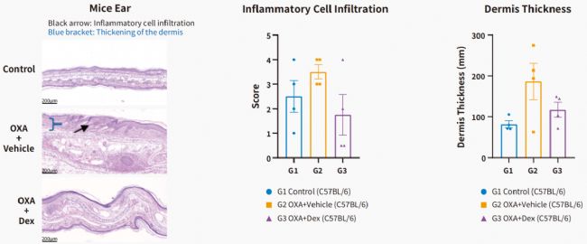 圖8. OXA誘導(dǎo)的特異性皮炎C57BL/6小鼠模型的小鼠病理照片及病理評(píng)分。