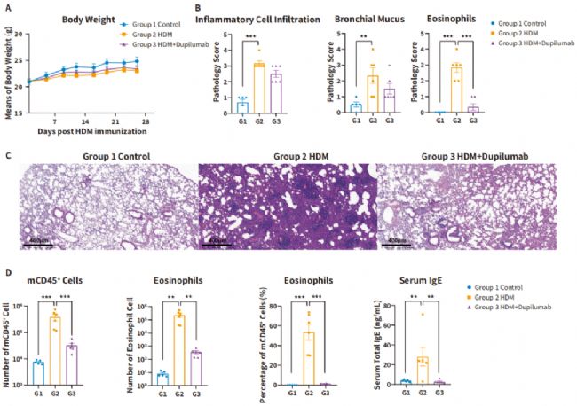 圖11. HDM誘導(dǎo)的小鼠哮喘模型。 (**P<0.01,***P<0.001)