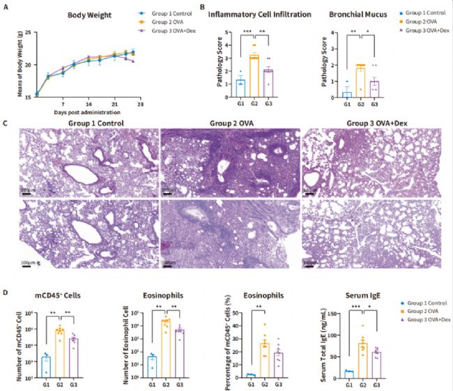圖12. OVA誘導(dǎo)的小鼠哮喘模型。 (*P<0.05,**P<0.01,***P<0.001)