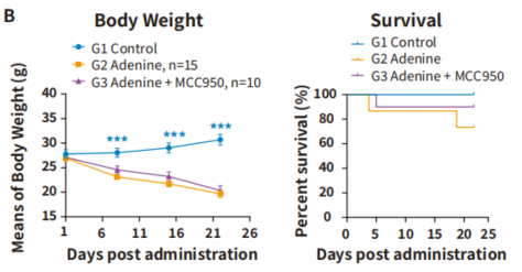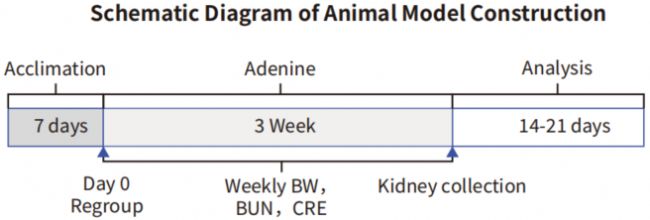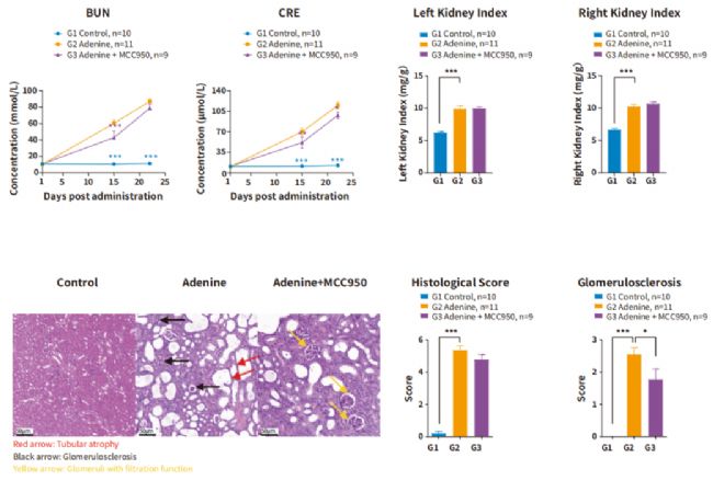 圖15. 腺嘌呤誘導(dǎo)的慢性腎病小鼠模型的藥效評(píng)價(jià)。(*P<0.05,**P<0.01,***P<0.001)
