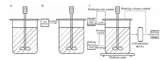 相比于為期14天的傳統流家培養,反應器灌流培養除了pH、DO、溫度、攪拌等控制模塊外,還包 含了連續的培養基流入(media)模塊、通過細胞截留設備 實現的細胞液收獲模塊(harvest),以及控制罐內恒定細胞密度的細胞液流出 (bleeding)模塊 。灌流培養通過不斷移出副產物,同時補充營養物質,因此可提供對細胞穩定且有利的生長環境。與批次培養和補料批次培養相比,灌流培養可以在高細胞密度環境下長時間維持穩定培養環境,同時降低產物 在培養基里的停留時間,這有利于提高產品質量。研究發現 ,灌流培養可實現培養基組 分中的動態變化對蛋白質糖基化的影響最小,這一研究結果表明灌流培養有利于提高產品質量。