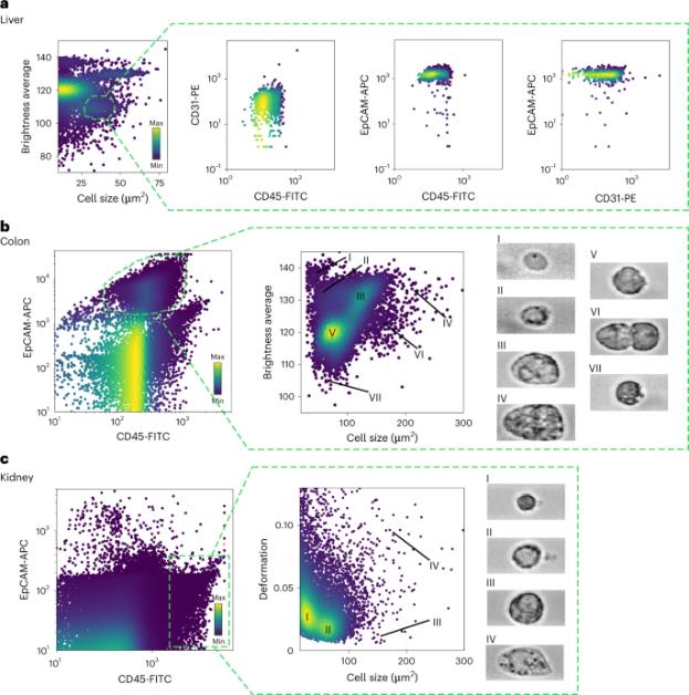 研究團隊篩選了不同的小鼠組織,并評估了機械解離組織后的細胞產量、存活率以及RT-FDC測量的可行性。他們展示了僅基于圖像提取的物理參數就可以區分組織細胞的亞群,增強了傳統的流式細胞術。此外,他們還檢查了來自小鼠和人類結腸的冷凍和新鮮活檢樣本,并通過主成分分析(PCA)和機器學習對多維數據進行分析,展示了RT-FDC可以區分健康和癌變組織。