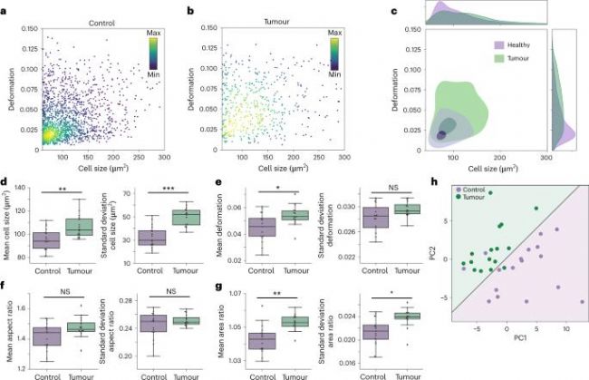 我們的研究發現,腫瘤組織中的細胞的機械特性與對照樣本顯著不同,表明我們的方法在檢測結直腸癌方面具有潛力。圖2a-c中單個小鼠的代表性圖表顯示,腫瘤中的細胞與其健康對應物相比,細胞大小更大,變形更高。對所有32個樣本的分析表明,腫瘤中的細胞具有顯著較高的平均細胞大小、變形和面積比,效應大小從中等到強(圖2d、e和g)。腫瘤樣本還表現出更大的異質性,如圖2c中廣泛的分布以及細胞大小和面積比的標準偏差顯著增加(圖2d和g)。