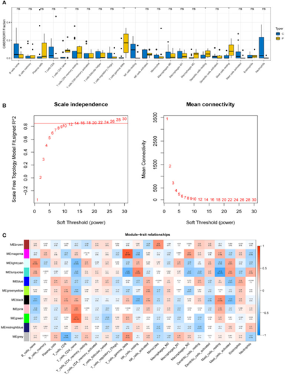 本文中,作者使用R軟件包"WGCNA"構(gòu)建了WGCNA,以識別與糖尿病腎病患者免疫細胞相關(guān)性最高的模塊。 具體來說,首先對樣本數(shù)據(jù)進行了預處理,并剔除了異常值。隨后,"WGCNA"軟件包構(gòu)建了相關(guān)矩陣。選擇最佳軟閾值將相關(guān)矩陣轉(zhuǎn)換為鄰接矩陣,并根據(jù)鄰接矩陣創(chuàng)建拓撲重疊矩陣(TOM)。利用基于TOM的相異性度量,采用平均關(guān)聯(lián)分層聚類將具有相似表達模式的基因歸類為基因模塊。與免疫細胞相關(guān)性最強的兩個模塊被選為關(guān)鍵模塊,用于后續(xù)分析。