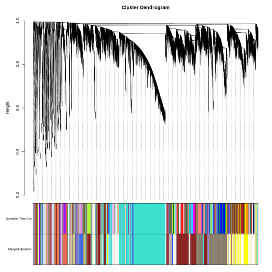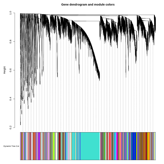 6.為了更清晰地反映出樣本基因的聚類關(guān)系,我們將這些基因劃分成了若干個模塊,每個模塊至少存在30個基因,每一個顏色代表一個模塊,將劃分后的模塊和樣本基因的層次聚類樹一起顯示,如下圖所示: