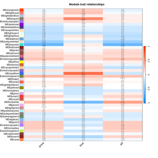 7.載入file1和file2,將性狀信息和模塊信息相關(guān)聯(lián),并繪制模塊與性狀之間的相關(guān)性熱圖。