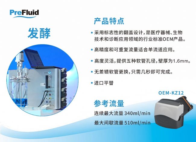 蠕動泵在發酵過程中起著一個重要作用——調節反應器中的許多重要成分。包括測量和控制Ph值,添加營養物,測量壓力,以及防止泡沫形成。其優勢有: