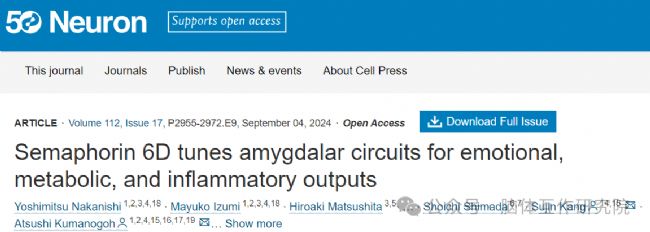 參考文獻:Nakanishi, Y., Izumi, M., Matsushita, H., Koyama, Y., Diez, D., Takamatsu, H., ..., Shimada, S., Kang, S., & Kumanogoh, A. (2024). Semaphorin 6D tunes amygdalar circuits for emotional, metabolic, and inflammatory outputs.Neuron, 112(5), 2955–2972.