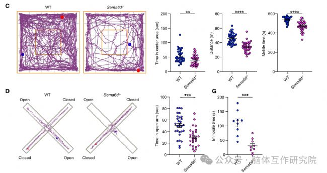 該研究通過全基因組分析揭示了SEMA6D作為一個與人類精神和代謝特征相關的多效性基因。為了進一步探究SEMA6D在行為和代謝中的作用,研究者們對Sema6d基因敲除(Sema6d-/-)小鼠進行了一系列的的行為測試,包括開放場測試、高架十字迷宮測試、社交互動測試和強迫游泳測試,以評估SEMA6D在焦慮樣、抑郁樣行為以及社交互動中的功能。
