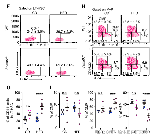 圖2:分析了高脂飲食喂養的Sema6d-/-小鼠骨髓中的造血干細胞和祖細胞,包括長期造血干細胞(LT-HSCs)、多能祖細胞(MPPs)和髓系祖細胞(MyPs)的比例。