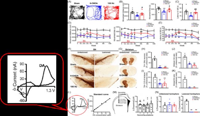 首先通過行為學實驗比較了EA刺激的頻率,找到了最佳的EA刺激方式,在特定治療穴位進行 100 Hz EA 刺激可有效緩解 6-OHDA 損傷大鼠模型中的運動障礙,并產生明顯的時間依賴性。隨后免疫組化結果顯示,EA刺激并不會恢復6-OHDA誘導的帕金森模型大鼠黑質紋狀體(DA)能神經細胞的數量。