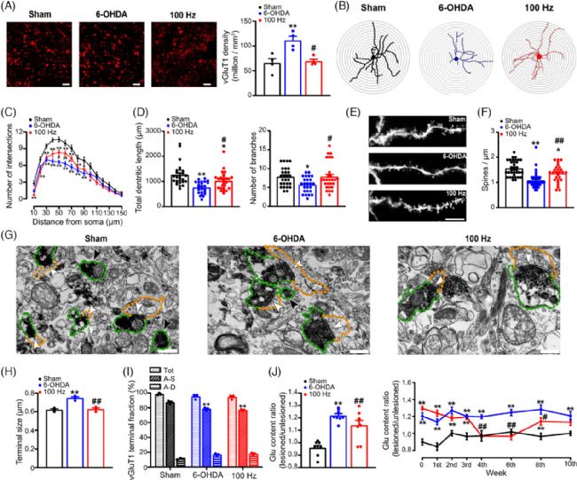 作者通過免疫熒光染色技術觀察囊泡谷氨酸轉運蛋白(vGluT 1)的密度,發現6-OHDA誘導的帕金森模型大鼠皮質紋狀體軸突末端的密度會升高,依靠高爾基體浸漬技術,6-OHDA誘導的帕金森模型大鼠的神經元中觀察到樹突分支的數量減少,但是這種減少可被100 Hz EA刺激逆轉,EA刺激帕金森模型大鼠組總樹突長度和分支數目有明顯的升高,突觸的結構受EA刺激會發生變化。電子顯微鏡下發現EA刺激導致帕金森模型大鼠皮質紋狀體谷氨酸能神經元軸突末端尺寸變小。