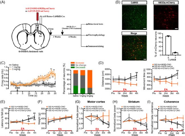 為了進一步闡明皮質紋狀體谷氨酸能神經元在EA刺激治療 6-OHDA誘導的帕金森模型大鼠中的作用,作者通過化學遺傳技術激活6-OHDA誘導的帕金森模型大鼠皮質紋狀體谷氨酸能神經元來逆轉EA刺激的影響。