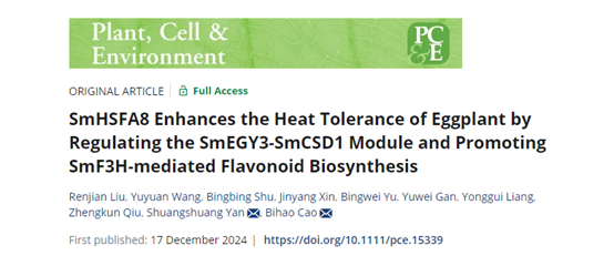 2024年12月17日,華南農業大學園藝學院曹必好教授團隊在Plant, Cell & Environment(中科院一區Top期刊,影響因子7.6)在線發表了題為SmHSFA8 enhances the heat tolerance of eggplant by regulating the SmEGY3-SmCSD1 module and promoting SmF3H-mediated flavonoid biosynthesis的研究論文。該文章借助DAP-seq技術探究了SmHSFA8通過調控SmEGY3-SmCSD1模塊和SmF3H介導的類黃酮生物合成提高茄子耐熱性的分子機制。