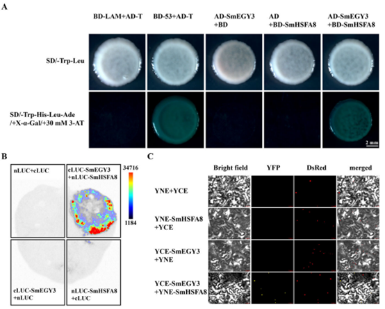 圖1 SmHSFA8與SmEGY3的互作及活性分析