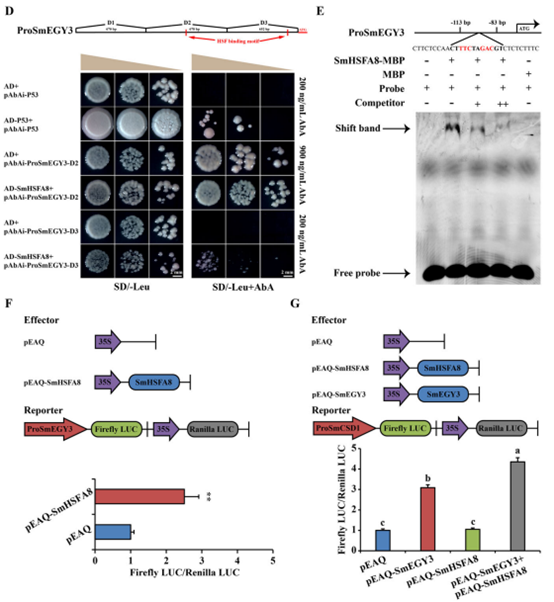 以SmEGY3作為誘餌蛋白,通過酵母雙雜交(Y2H)實驗篩選到了熱激轉錄因子 SmHSFA8,并通過熒光素酶互補成像(LCI)和雙分子熒光互補(BiFC)等實驗證實 SmHSFA8 與 SmEGY3 相互作用。此外,酵母單雜交(Y1H)、凝膠遷移實驗(EMSA)和雙熒光素酶報告(DLR)實驗表明 SmHSFA8 可結合 SmEGY3 啟動子并激活其表達,且兩者相互作用增強了 SmEGY3 對 SmCSD1 的激活功能。這些結果表明 SmHSFA8 可能參與調控茄子的耐熱性。