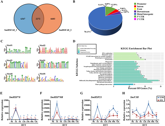 為了闡明 SmHSFA8 調控茄子耐熱性的分子機制,作者進行了DAP - Seq實驗。基于兩次重復,共鑒定出2272個SmHSFA8 結合峰,其中12.59% 位于靶基因的啟動子區域,有286個基因。使用 Meme-ChIP鑒定出六個具有高可信度的motif,這些motif可能是 SmHSFA8 的結合位點,其中基序3和6的序列與HSFs 結合位點的典型基序HSEs高度相似,并找到了SmHSPs基因:SmHSP70、SmHSP70B和SmHSP21。KEGG分析顯示SmHSFA8 的靶基因參與多個代謝過程,如類黃酮生物合成,SmF3H同樣參與類黃酮生物合成過程。經過HTT(高溫處理)后,SmHSP70B、SmHSP21和SmF3H在耐熱茄子品系中的表達量高于熱敏茄子品系。