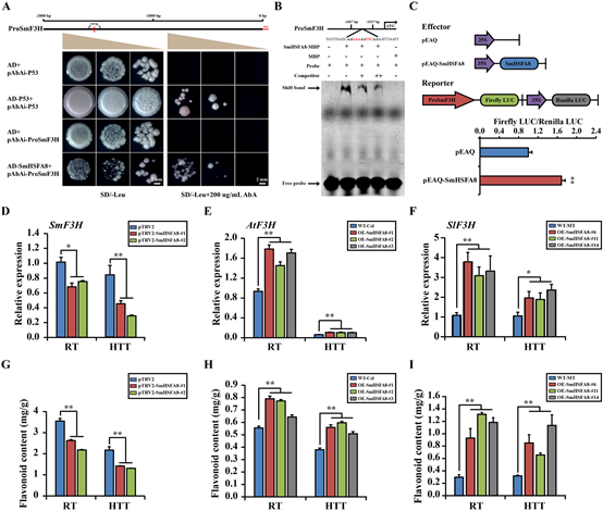 凝膠遷移實驗(EMSA)、酵母單雜交(Y1H)、雙熒光素酶報告(DLR)等實驗結果表明,SmHSP21、SmHSP70、SmHSP70B和SmF3H是SmHSFA8的下游靶基因。SmHSFA8能調控茄子中SmHSPs和SmF3H基因的表達以及類黃酮的生物合成。通過VIGS沉默SmF3H降低了茄子的類黃酮含量和耐熱性,此外,外源類黃酮處理減輕了HTS對茄子的損害。
