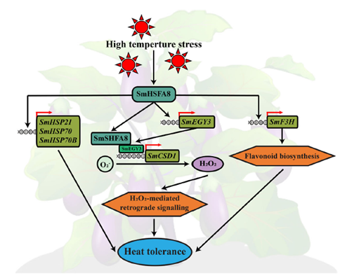 茄子的幼苗、花器官和果實均會受到高溫脅迫的影響。高溫脅迫嚴重影響了茄子的生長發育、生產以及商品價值。然而,關于茄子耐熱調控的分子機理尚不清晰。該團隊前期篩選和鑒定了耐熱型和熱敏型茄子材料,分析了它們在高溫脅迫下生理生化的差異;對高溫脅迫下耐熱型和熱敏型茄子材料進行了轉錄組測序分析,篩選和鑒定出候選高溫響應基因SmEGY3;并探究了SmEGY3-SmCSD1模塊在茄子調控耐熱中的分子機制。