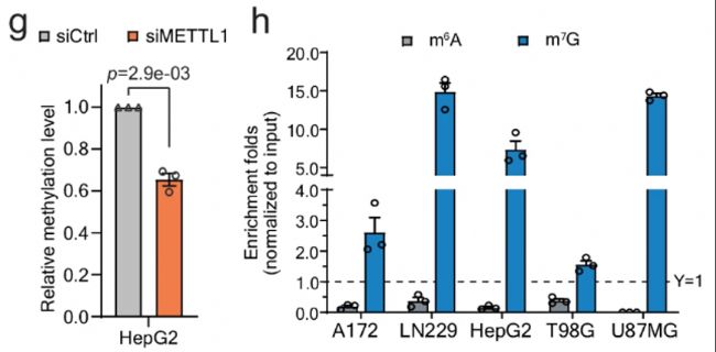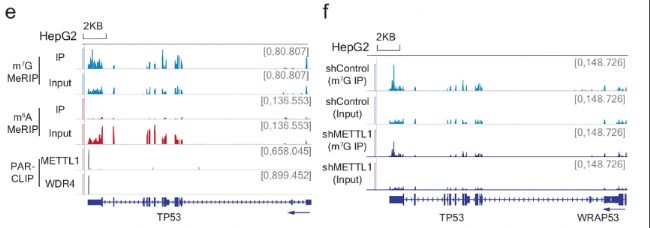 圖:MeRIP-seq揭示TP53轉錄本上存在m7G修飾,受METTL1調控[4]