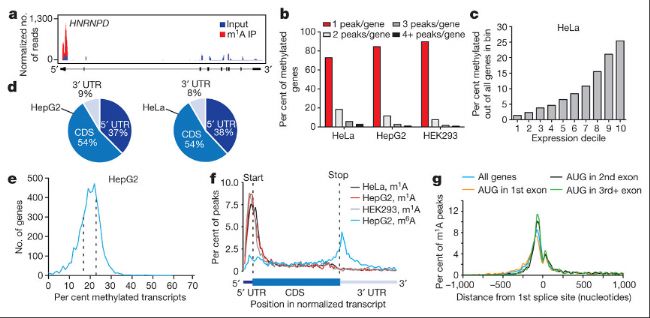 本研究對人HeLa(宮頸腺癌),HepG2(肝細胞癌)和HEK293(胚胎腎)細胞系(ATCC)和原代小鼠胚胎成纖維細胞(MEF)(C57BL / 6,ATCC)進行基于抗體富集的RNA甲基化免疫沉淀測序(MeRIP-seq),在轉錄組范圍定位m1A位點,并將其與Dimroth重排反應進行耦聯以獲得高分辨率m1A圖譜。結果表明m1A在第一個剪接位點上游起始密碼子周圍富集,m1A傾向于修飾翻譯起始位點周圍一些更結構化的區域,可以對生理條件做出動態響應,并與蛋白質生成呈正相關。