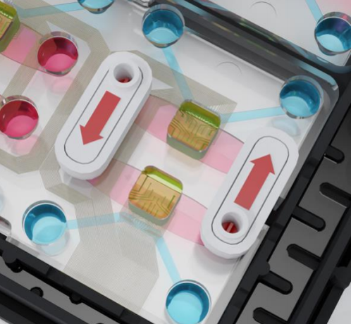 流體跳線(紅色箭頭裝置):流體跳線是指在類器官芯片內用于連接不同微流道、實現液體或氣體交換的通道。微流控芯片通常由多個微流道組成,這些微流道通過流體跳線相互連接。它們是芯片內流體動力學的核心,確保細胞、營養物質、藥物和廢物能夠在不同區域之間順利流動。
