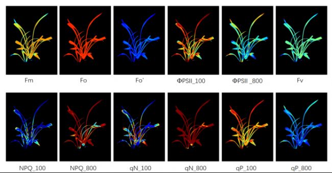 圖1 植物葉綠素?zé)晒鈪?shù)成像示例圖,包括Fm,F(xiàn)o,F(xiàn)o’ , FPSII, Fv, NPQ, qN, qP等。