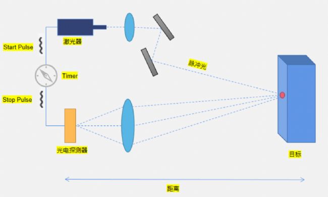 時(shí)間飛行(ToF)技術(shù)是一種測(cè)量物體距離的方法,它通過(guò)計(jì)算光波從發(fā)射到反射回傳感器所需的時(shí)間來(lái)確定空間信息。ToF系統(tǒng)通常包括發(fā)射器(激光光源)和接收器(探測(cè)器)及時(shí)間記錄裝置(tdc)