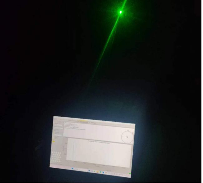 針對(duì)其實(shí)際表現(xiàn),搭建了一個(gè)簡(jiǎn)易的激光測(cè)距光路來(lái)驗(yàn)證設(shè)備本身的性能,該簡(jiǎn)易光路的激光器使用的是40MHz重頻的532nm波長(zhǎng)的激光器,將綠光打在白板上,陣列探測(cè)器與激光器的出光孔在同一水平線上如下圖所示: