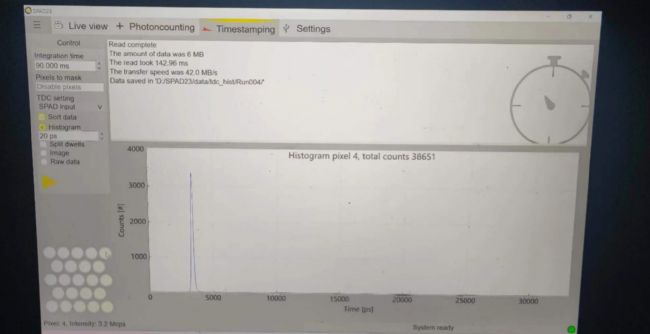 快速的搭建好實(shí)驗(yàn)設(shè)備后,只需要給SPAD23通入電源及USB連接線,連接好激光器的同步觸發(fā)信號(hào)后,設(shè)置直方圖的Bin寬為20ps(短為10ps),探測(cè)時(shí)間為90ms,點(diǎn)擊開(kāi)始按鈕后,瞬間生成直方圖,通過(guò)下圖的直方圖的圖表信息,光子的峰值在3100ps,粗略計(jì)算兩者之間的距離為0.93m÷2=0.465m,通過(guò)直方圖存儲(chǔ)的可視化數(shù)據(jù)精細(xì)計(jì)算,峰值所在的時(shí)間為第1590個(gè)Bin中,也就是3180ps,所以zui終距離為0.477m,這與實(shí)際量測(cè)結(jié)果相差無(wú)幾。