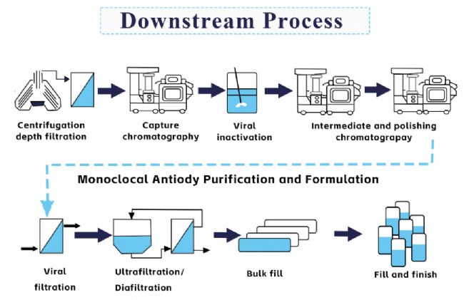 下游工藝(Downstream Process, DSP)是生物制藥生產的關鍵環節,主要目標是將上游培養獲得的生物分子(如單克隆抗體、重組蛋白)進行純化、純化和制備符合臨床要求的藥品。