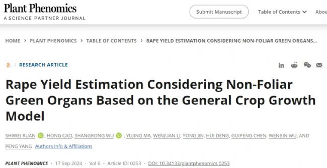 Plant Phenomics | 中國農業科學院農業資源與農業區劃研究所基于通用作物生長模型的油菜非葉綠色器官產量估算研究